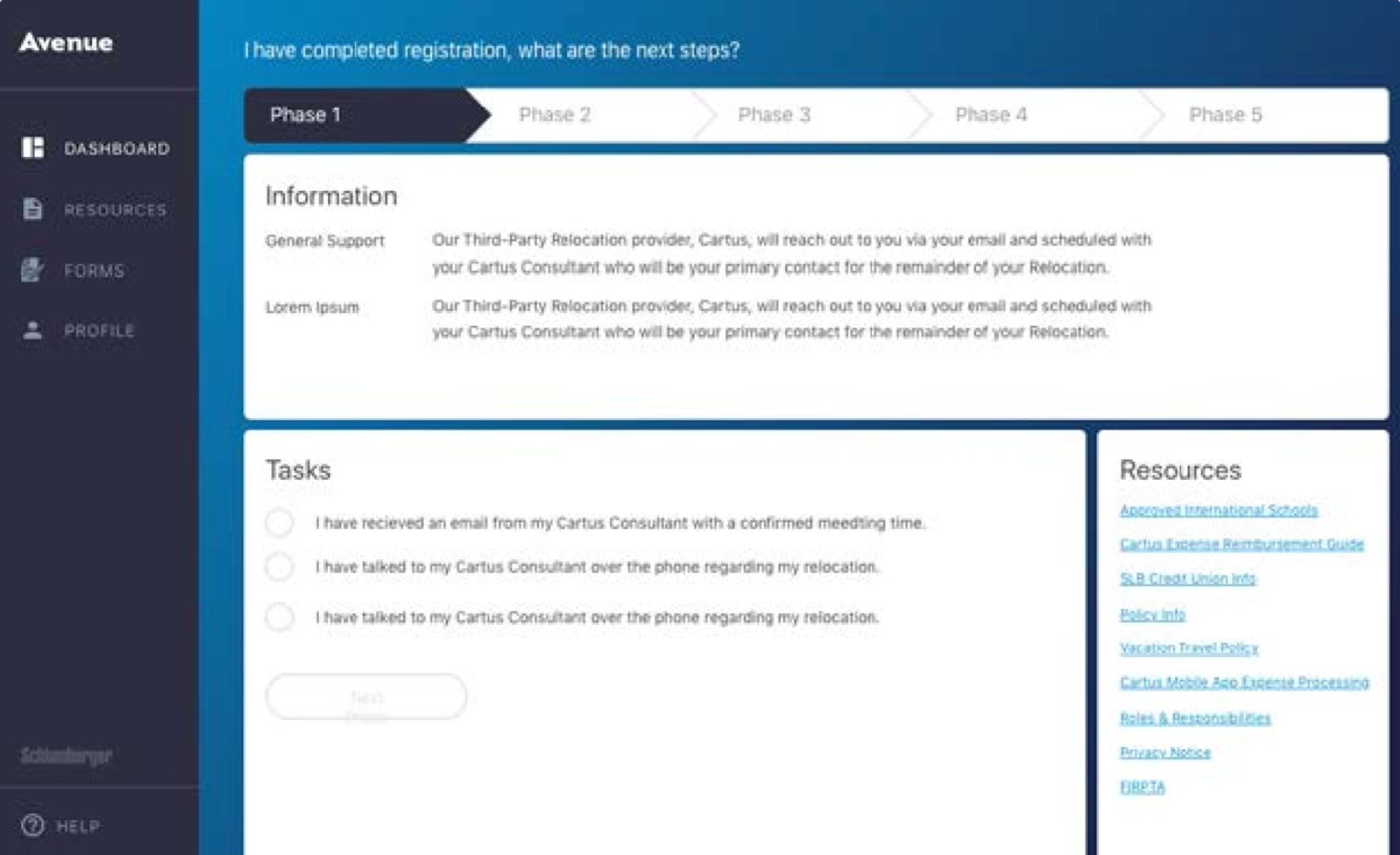 DESCRIPTION: Avenue is a software application that assists with Schlumberger employees moving into the United States. Formerly a process that took several weeks, involved many disparate contacts, and provided no visibility into overall progress, Avenue simplified things considerably and included intelligent data mapping, automation of repetitive procedures and personalized the experience according to user needs.